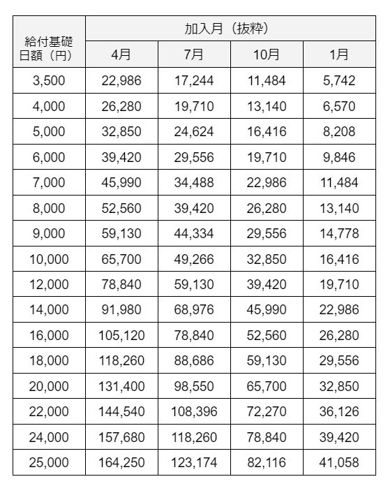 たとえば、給付基礎日額の中で最も安い3,500円の場合、年間の保険料は22,986円です。逆に、給付基礎日額が一番高い25,000円のときは、年間で164,250円になります。