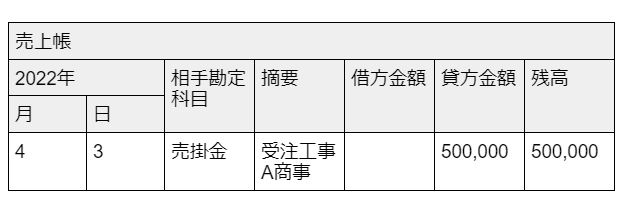 - 4月3日:取引先A商事から50万円で受注していた工事が完成した