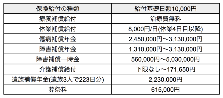 一人親方の労災保険について、ここまでくわしく解説してきましたが、具体的な例がないとピンとこない方もいらっしゃることでしょう。そこで、一人親方・妻・子2人の4人家族で、給付基礎日額10,000円で特別加入労災に加入した場合を想定し、給付額の一例をご紹介します。